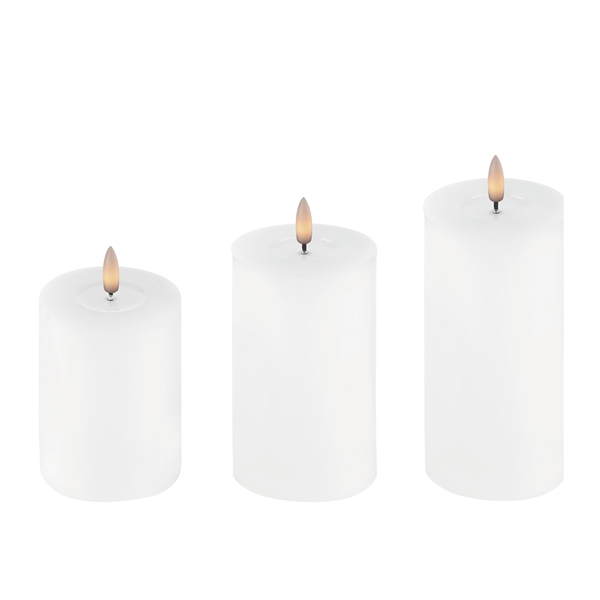 3-Pak LED Bloklys 5 x 10, 12,5 og 15 cm Vokslys med Resin, Hvid