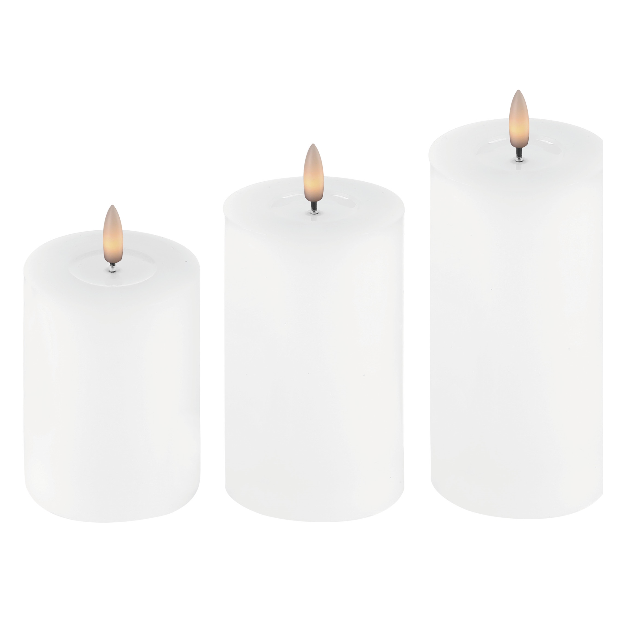 3 hvide LED bloklys i tre højder med 3D flamme & fjernbetjening