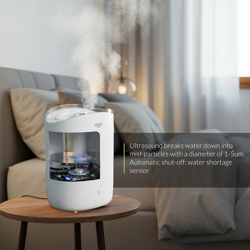 Produkt:  Adler AD 7971 Ultralyds Luftfugter med Touch Panel & Automatisk Slukfunktion, 5 L, Hvid