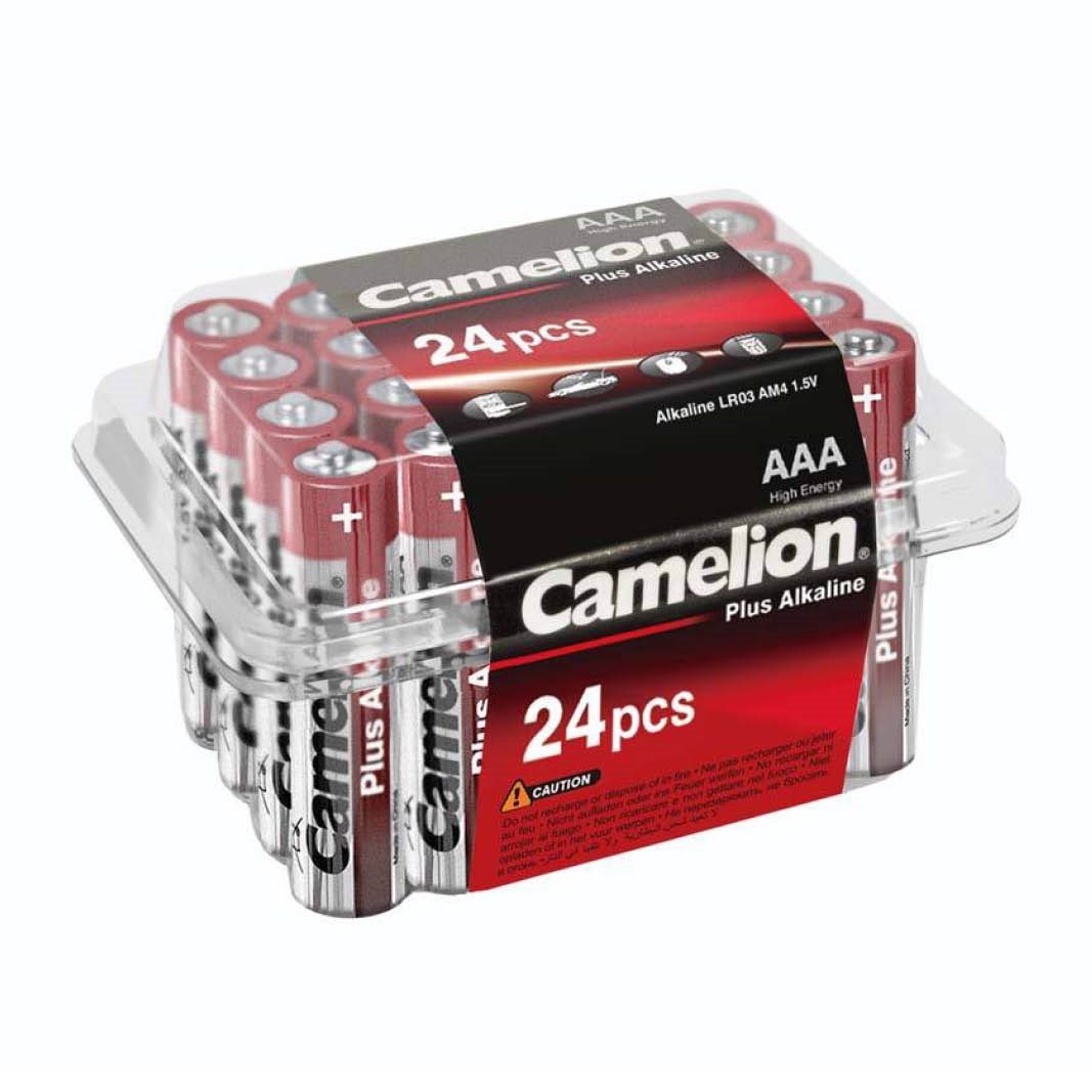 Camelion AAA alkaline plus batterier i 24 stk. pakning, æsken kan lukkes igen efter åbning for nem opbevaring.