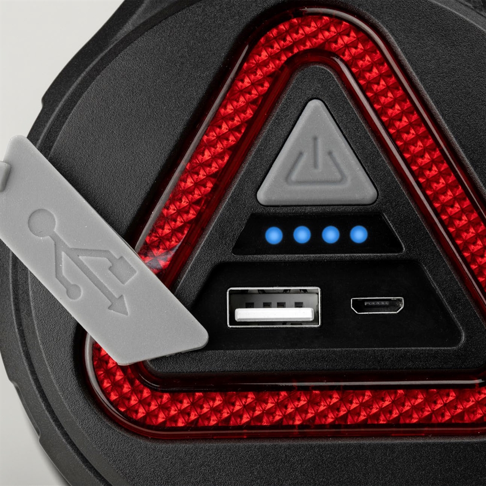 Den indeholder også en indbygget powerbank til opladning af dine enheder via USB. Bagpå er der en integreret advarselstrekant med blinkfunktion – ideel ved nødsituationer, dog ikke som erstatning for den lovpligtige advarselstrekant.