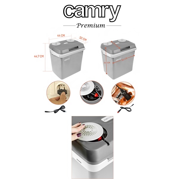 Tag kolde drikke og frisk mad med overalt med Camry CR 8065 køleboks 21L. Den effektive Peltier-teknologi køler op til 12–14°C under omgivelsernes temperatur og kan holde på varmen op til ca. 60–65°C. Med 21 liters kapacitet er der god plads til flasker og mad, mens den solide PU-isolering sikrer stabil temperatur. Tilslut nemt via 12V i bilen eller 230V derhjemme. Vælg mellem 3 effekttrin (LOW/MEDIUM/FULL) for optimal ydeevne. Støjsvag drift (45 dB) og praktisk bærehåndtag gør den ideel til camping, ferie og udflugter.