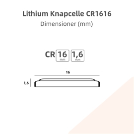 CR1616 er et af de mest populære 3V lithium knapcellebatterier til små, energibesparende produkter, hvor stabil drift og kompakt størrelse er afgørende. Batteriet måler 16 mm i diameter og 1,6 mm i tykkelse og bruges ofte i ure, bilnøgler (key fobs), cykelcomputere, sportsudstyr, medicinske hjælpemidler og en række IoT-enheder. Den konstante spænding gør CR1616 ideel, når udstyret kræver præcis og jævn strømforsyning.
