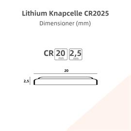 CR2025 er et af de mest udbredte 3V lithium knapcellebatterier og bruges i en lang række kompakte enheder, hvor både stabil spænding og lang driftstid er vigtig. Batteriet måler 20 mm i diameter og 2,5 mm i tykkelse og fungerer perfekt i produkter som bilnøgler, digitale ure, sensorer, cykelcomputere, elektroniske vægte og visse typer medicinsk udstyr. Kombinationen af høj energitæthed og lav vægt gør CR2025 til et ideelt batteri til moderne hverdagsapparater.
