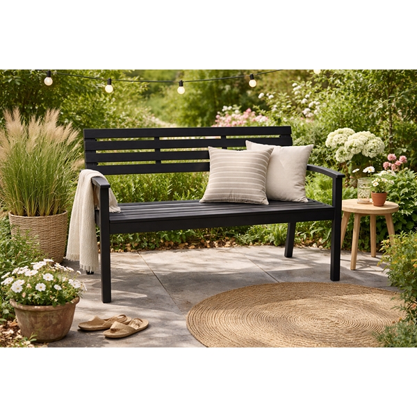 Denne elegante havebænk med ryglæn og armlæn kombinerer holdbarhed og moderne design. Rammen er fremstillet af galvaniserede stålrør med sort pulverlakering, som giver ekstra beskyttelse mod rust og vejr. De sort polywood-lameller er vedligeholdelsesfrie og vejrbestandige, hvilket betyder, at de tåler både sol og regn uden at kræve pleje. Bænken måler 115 x 55 x 85 cm, har en siddehøjde på 40 cm, vejer kun 14,5 kg, men kan bære op til 220 kg. Perfekt til haven, terrassen eller altanen.