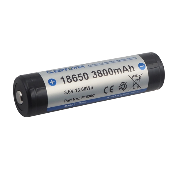 Keeppower Li Ion batteri 18650 3,6 volt 3800 mAh. Batteri med Panasonic celler fra Keeppower, sikrer høj og stabil ydelse. Erstatter batterier i lygter og fotoudstyr, kan genoplades og dermed spares mange penge i forhold til udskiftning af engangsbatterier. Kan anvendes til eCigaretter. Indbygget sikkerhedskredsløb.