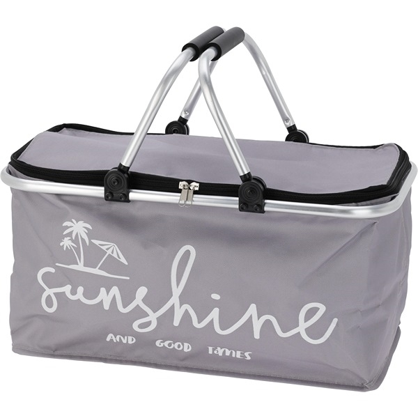 Denne praktiske køletaske er fremstillet i slidstærkt 600D polyester, som sikrer høj holdbarhed og lang levetid. Det isolerede indre holder effektivt indholdet køligt i flere timer og gør køletasken ideel til picnic, strandture, camping og indkøb. Rammen og håndtagene er designet i aluminium, som giver stabilitet og god bærekomfort. Køletasken kan foldes flad, når den ikke er i brug, hvilket gør den nem at opbevare. Kølekurven er dekoreret med teksten “Sunshine and good times”. Lynlåslukningen sikrer, at kulden bevares under transport.