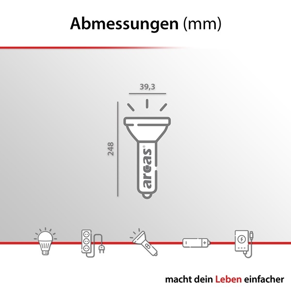 Kraftig stavlygter der lyser op til 350 meter, bruger 3 x C batterier (medfølger ikke).