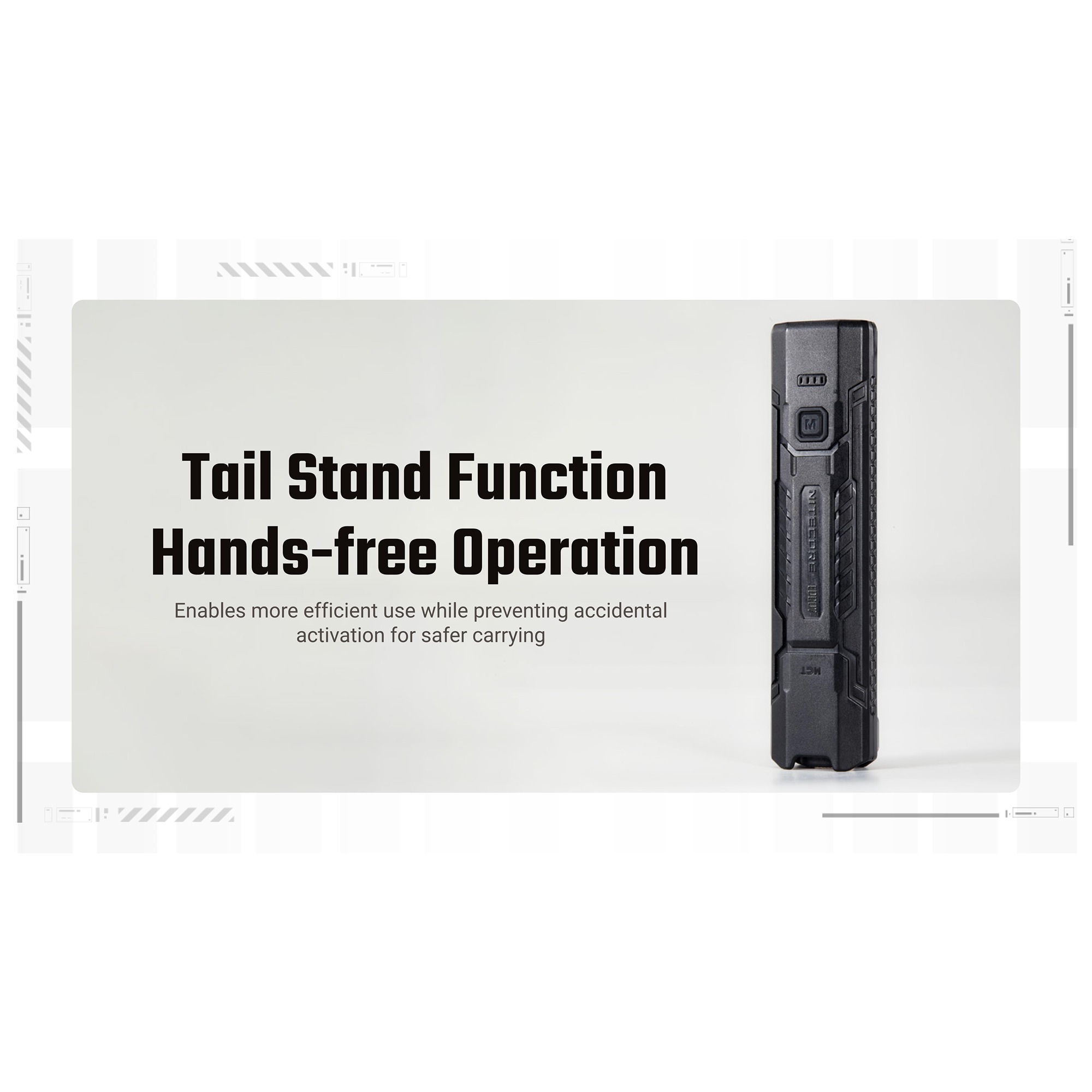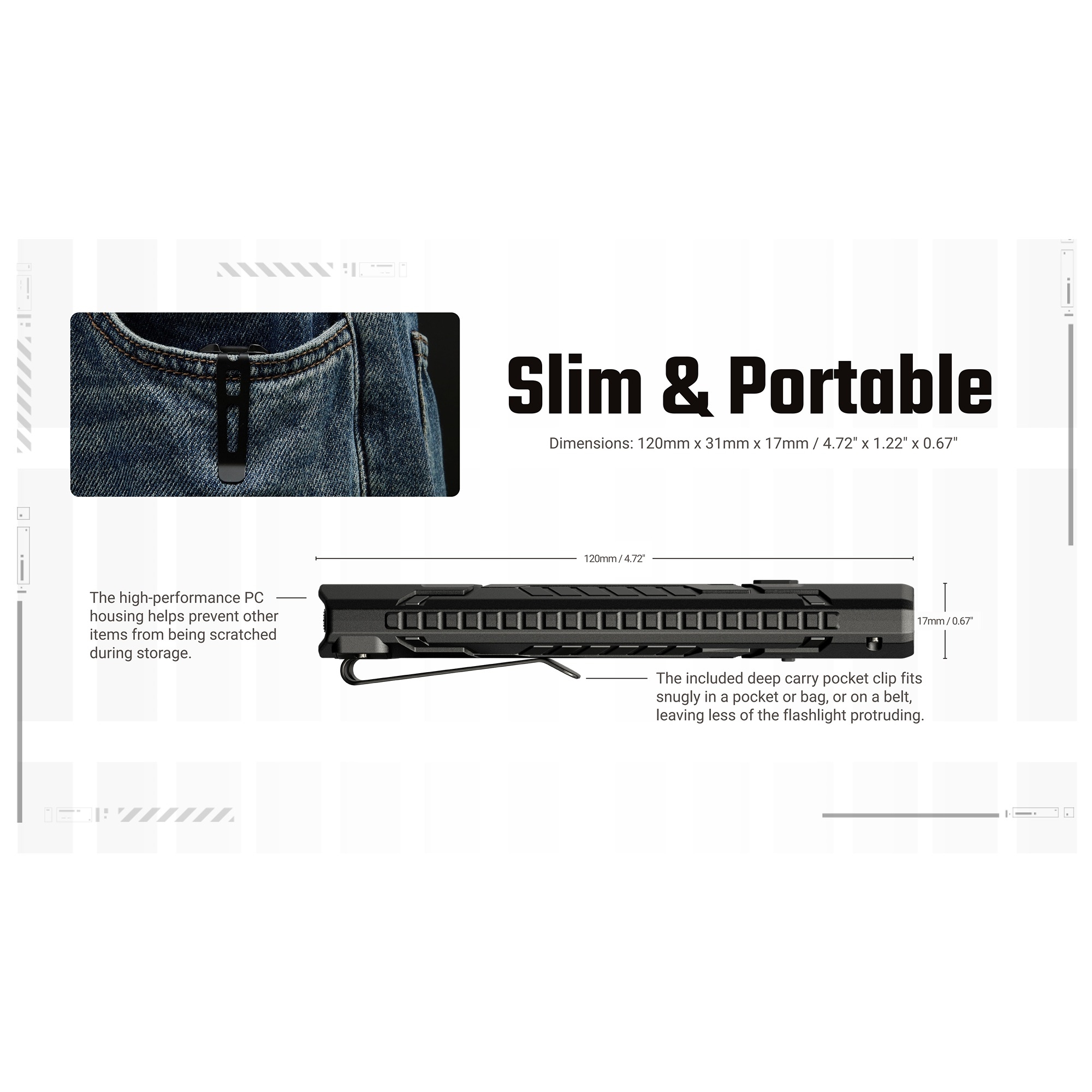 Nitecore lommelygten med flad bagende gør at den kan stå oprejst og bruges håndfrit. Det teksturerede greb, det lette hus i high-performance PC og klipsen i rustfrit stål understøtter en praktisk og realistisk anvendelse i både arbejde og fritid. Med op til 360 timers driftstid, fem lysniveauer samt STROBE og SOS er den klar, når du har brug for en kompakt, men seriøs lyskilde.