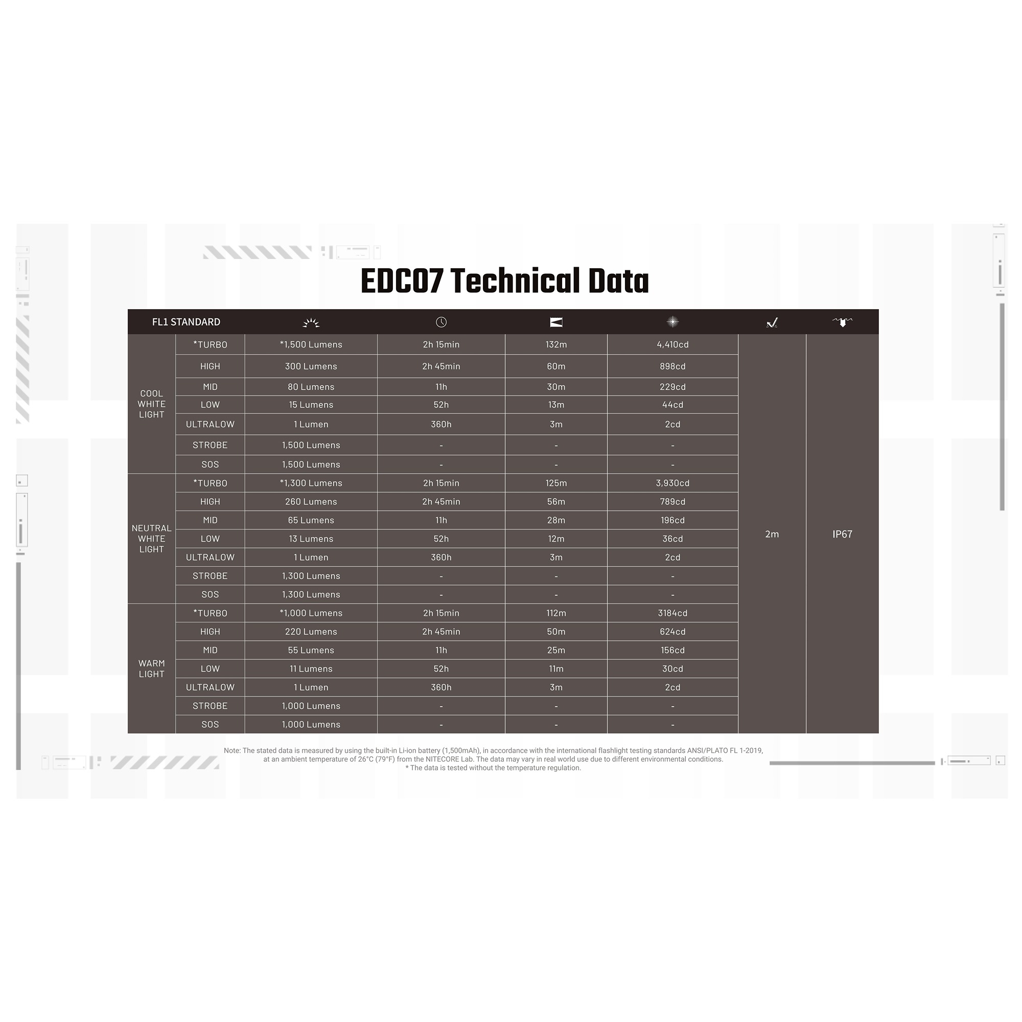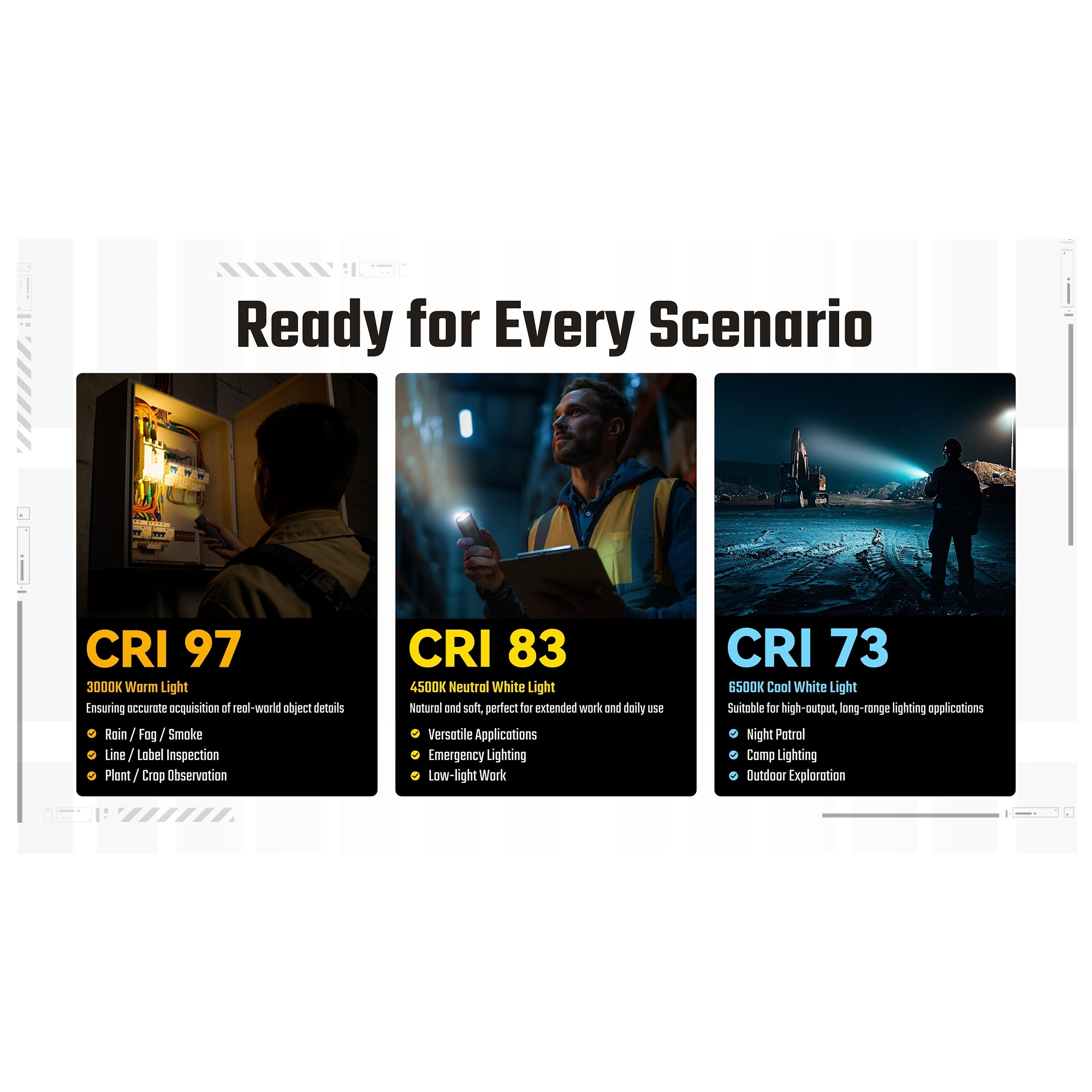 Det særlige ved Nitecore EDC07 er lysets alsidighed. Lygten har tre farvetemperaturer: varm 3000K, neutral 4500K og kølig 6500K. Det betyder, at du kan vælge et mere behageligt og detaljeret lys til inspektion, læsning og nært arbejde eller et skarpere lys til udendørs brug og overblik. Med CRI op til 97 gengiver den farver markant mere naturligt end mange traditionelle LED-lygter. Den er derfor velegnet til håndværk, teknisk arbejde, lager, bil, camping og som pålidelig hverdagslygte.