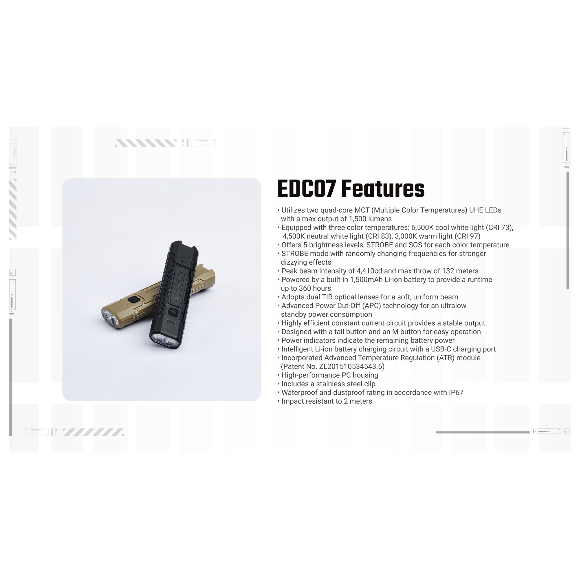 Produkt:  Nitecore EDC07 Genopladelig Lommelygte 1500 lumen, Desert Tan