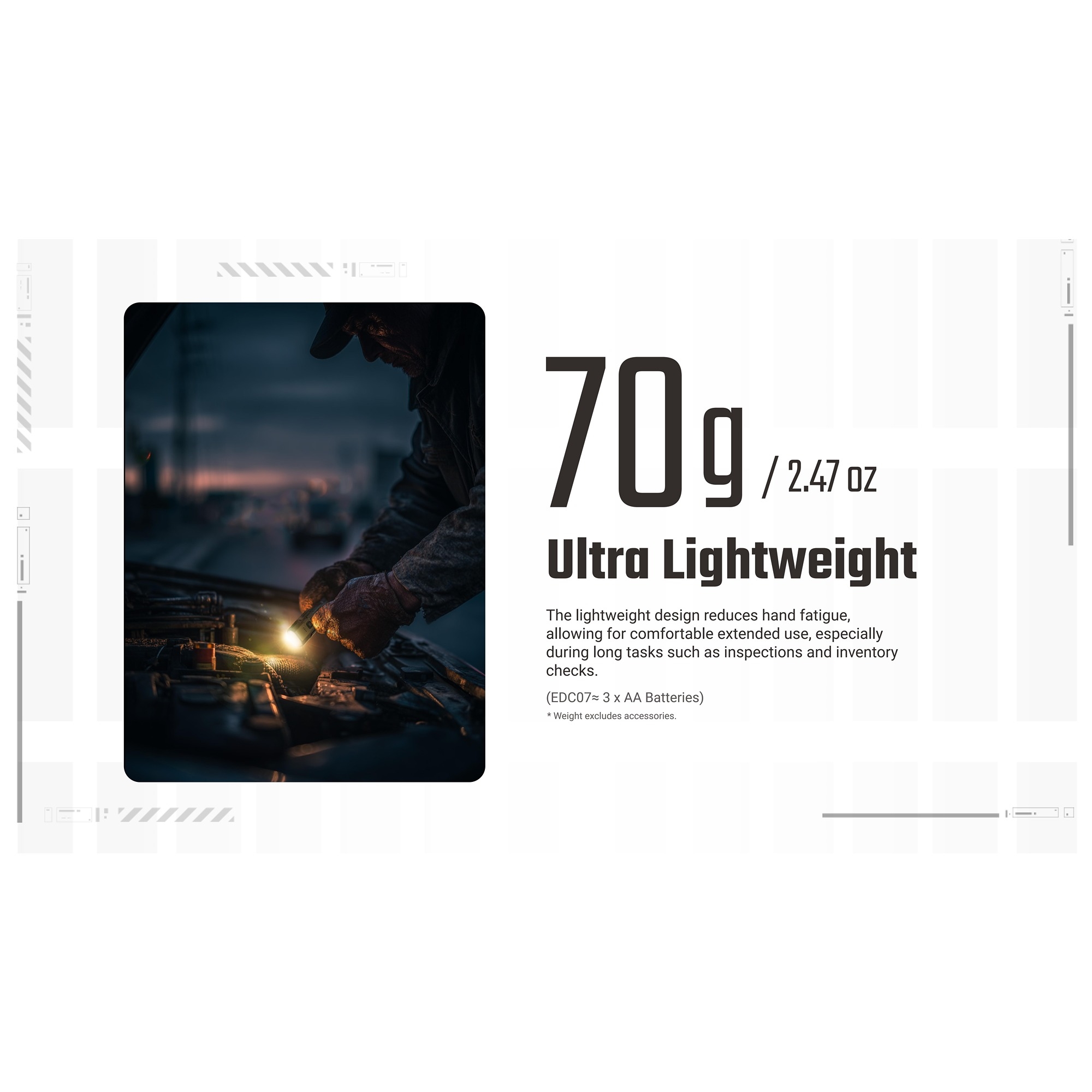 • Meget let konstruktion på 70 g gør den behagelig som EDC-lygte hele dagen.
