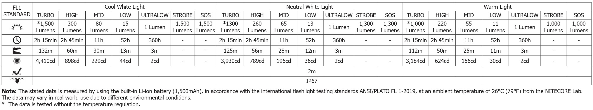 Drifttid ved højeste lysstyrke (Kold Hvid/1500 lumen): 2 timer og 15 min
