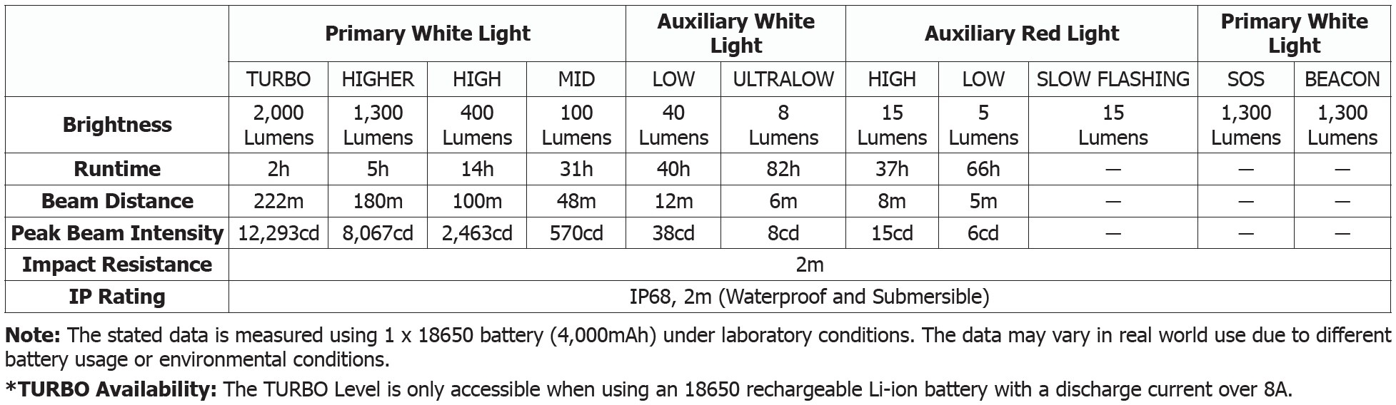 • 2000 lumen og 222 meters rækkevidde giver kraftig belysning, når du har brug for overblik og distance.