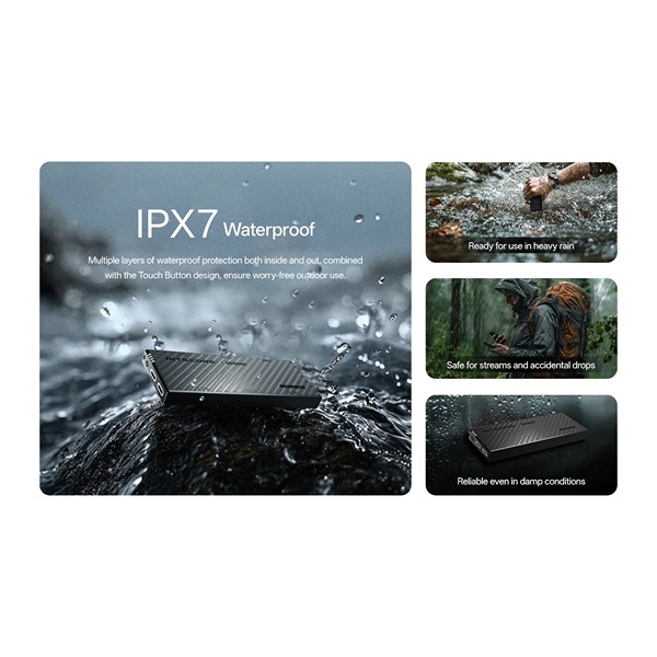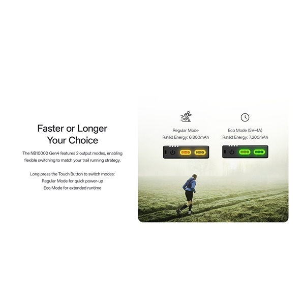 Via tænd/sluk-touchknappen kan du skifte mellem Regular Mode til hurtig opladning og Eco Mode, som giver langsommere opladning og længere driftstid. Powerbanken understøtter dermed både effektiv hurtig opladning powerbank-brug og energibesparende opladning. Derudover kan intelligente funktioner som RGB-lys ved USB-C-portene og “Knock to Wake” aktiveres, hvilket gør det nemt at betjene powerbanken i mørke eller kolde forhold – selv med handsker på – ved blot at banke let på toppen for at se portene og strømindikationen.
