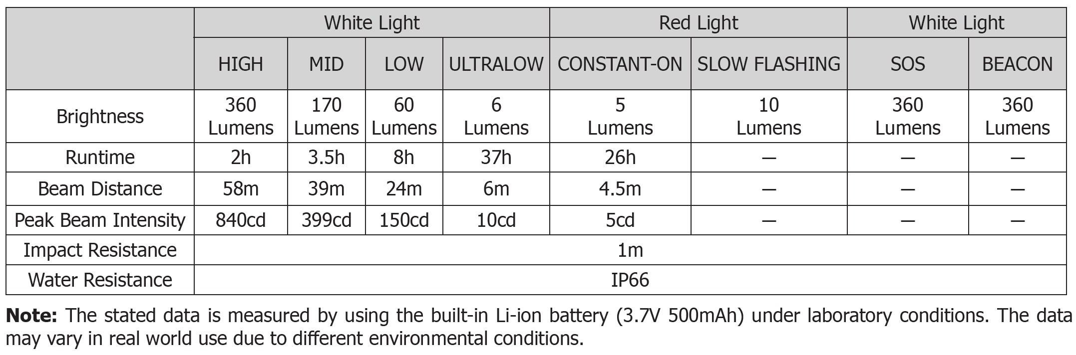 Drifttid ved højeste lysstyrke (Hvid/360 lumen) : 2 timer