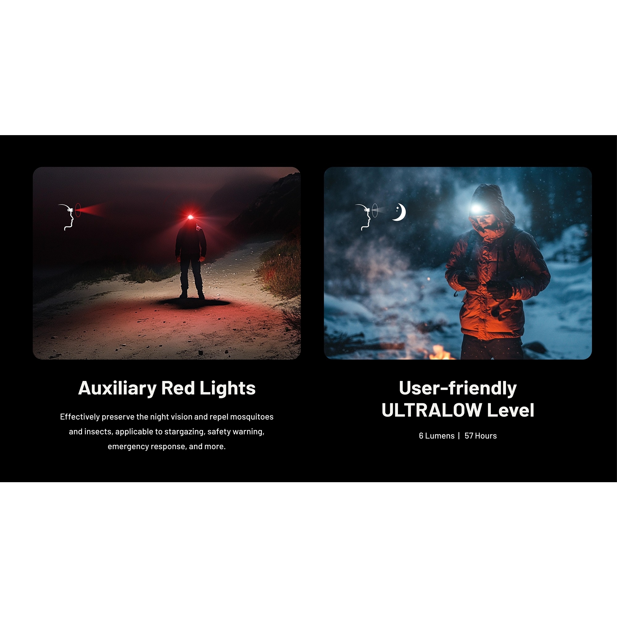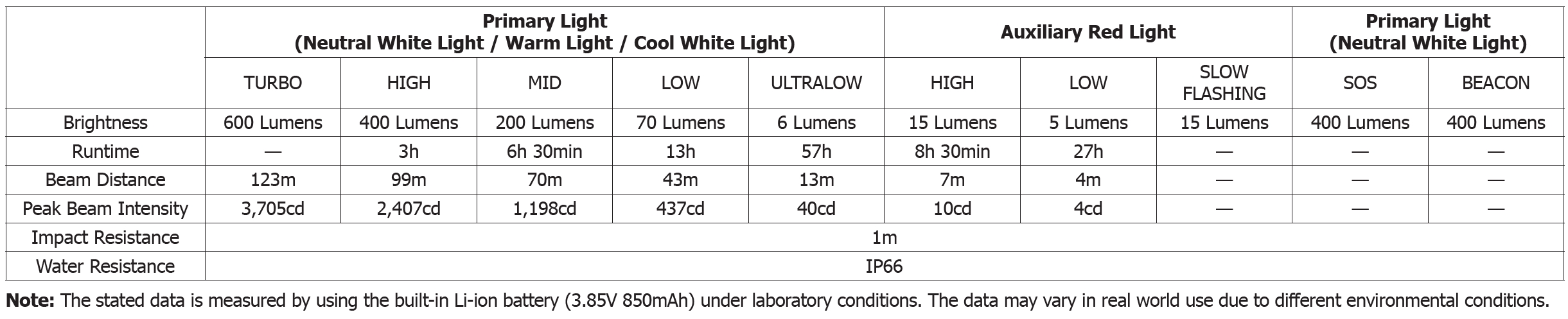 Drifttid ved laveste lysstyrke (Hvid/6 lumen): 57 timer