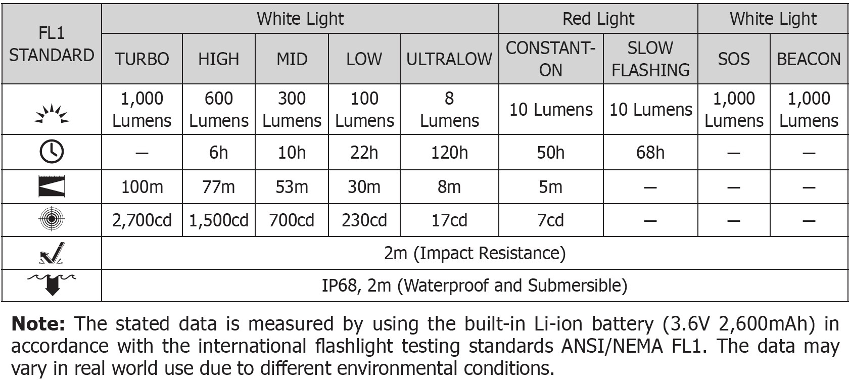 Det er muligt at vælge mellem 9 forskellige lysindstillinger, herunder både rødt og hvidt lys samt specialfunktioner som SOS og Beacon. Den røde funktion bevarer nattesynet og er ideel i lejr eller situationer, hvor du ikke vil blænde andre.
