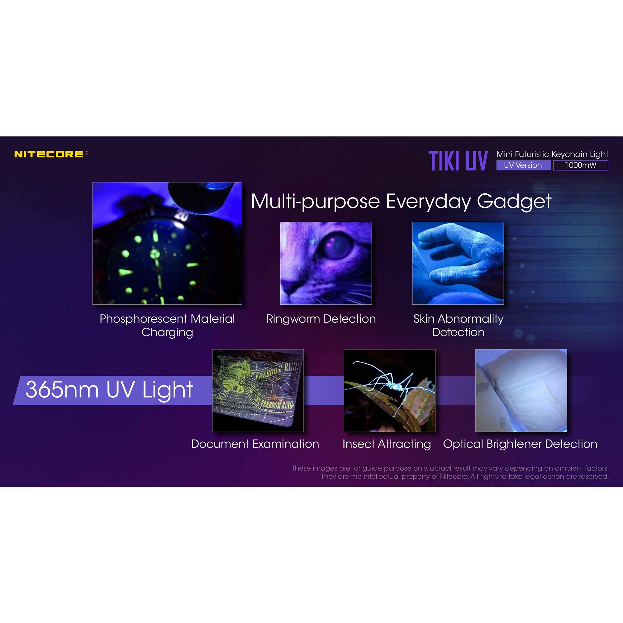Lygten kombinerer hvidt lys på op til 70 lumen med UV-lys ved 365 nm og en UV-effekt på op til 1000 mW. Det gør Nitecore TIKI UV velegnet til alt fra at finde småting i mørke og orientere sig på kort afstand til kontrolopgaver, hvor ultraviolet lys kan være en fordel. Den hvide lyskilde har en rækkevidde på op til 12 meter, hvilket passer godt til nære opgaver, nødsituationer og daglig brug.