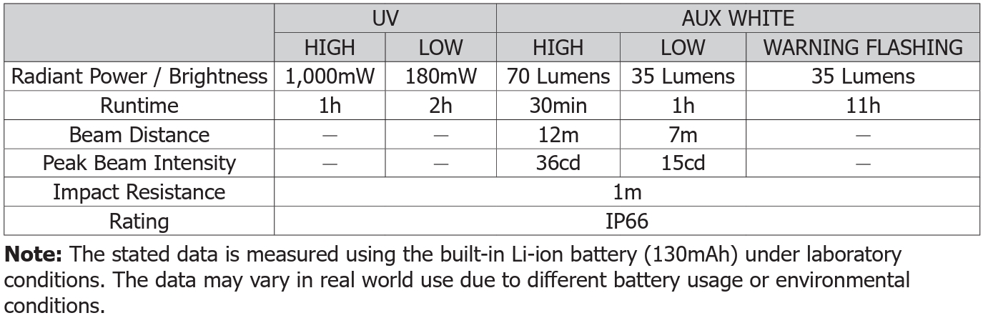 • Kombinerer hvidt LED-lys og 365 nm UV-lys i én meget kompakt nøgleringslygte.