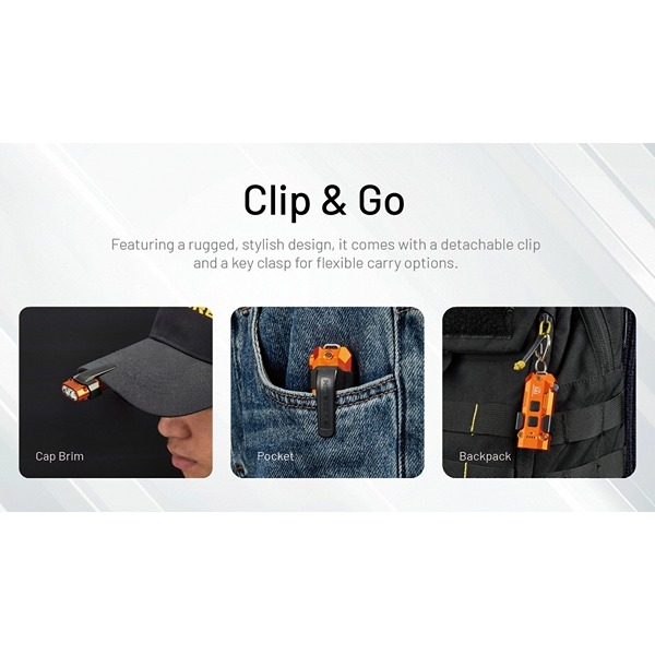 TIP3 leveres med clip og nøglering, så den nemt kan bæres på kasket, i lommen, på rygsækken eller på nøgleringen. En fleksibel løsning, der sikrer, at din nøgleringslygte altid er lige ved hånden.