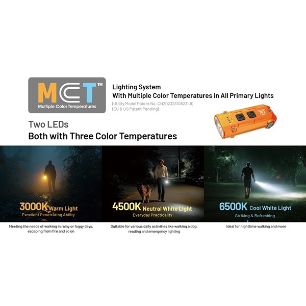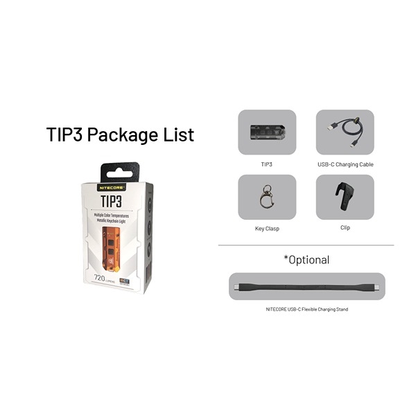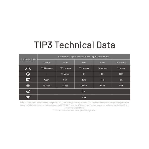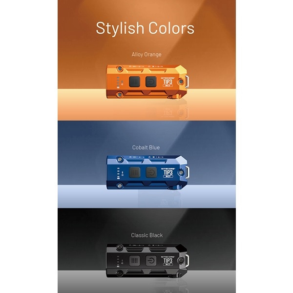 NITECORE TIP3 er en kompakt og kraftfuld EDC- og nøgleringslygte, der kombinerer høj ydeevne med minimal størrelse. Perfekt til nøgleringen, lommen eller som backup-lygte til hverdag, outdoor, løb og arbejde. Lygten er designet med den unikke MCT-teknoligi, hvilket giver tre farvetemperaturer (CRI): Neutral hvidt lys 4500K, koldt hvidt lys 6500K og varmt hvidt lys 3000K, så du altid kan vælge det lys, der passer bedst til miljøet. Forstå og læs mere om det smarte MCT-teknologi her. Her kan vælges imellem fem forskellige lysstyrker pr. farvetemperatur, fra TURBO til ultralav på 1 lumen med op til 160 timers drift