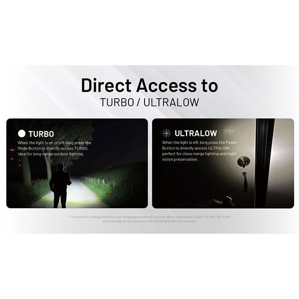 Koldt hvidt lys (6500K) - Turbo: 720 lumen | High: 220 lumen | Mid: 65 lumen | Low: 15 lumen | Ultralow: 1 lumen