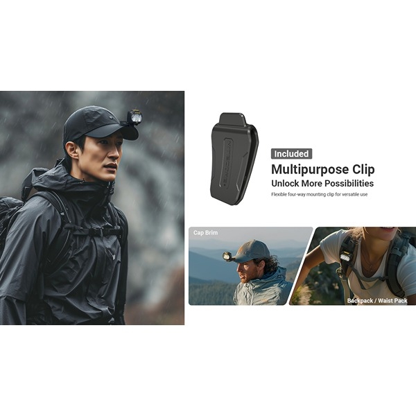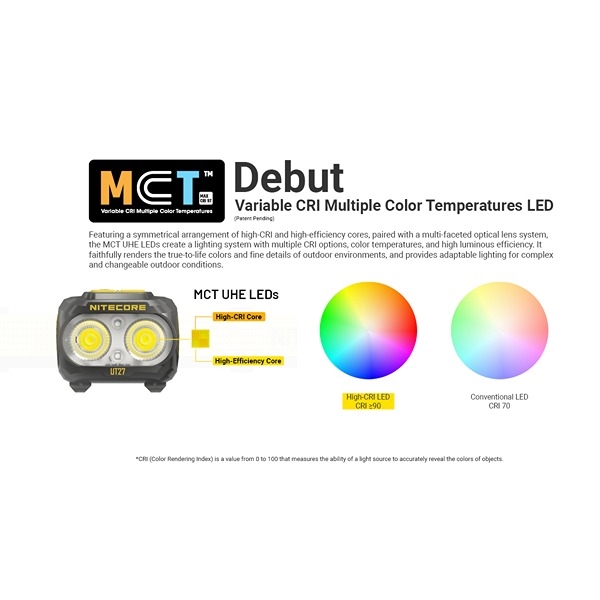 Pandelampen er udstyret med MCT UHE LED-teknologi, et rødt hjælpelight til nattesyn og dual power-knapper for hurtig og intuitiv betjening. Den vejer kun 74 g, har IP66-beskyttelse, et 90° justerbart beslag og et selvlysende batterirum, der gør batteriskift nemt i mørke. UT27 leveres med et reflekterende, åndbart pandebånd, multifunktionsclip og diffuserpose – klar til ethvert outdoor-eventyr.
