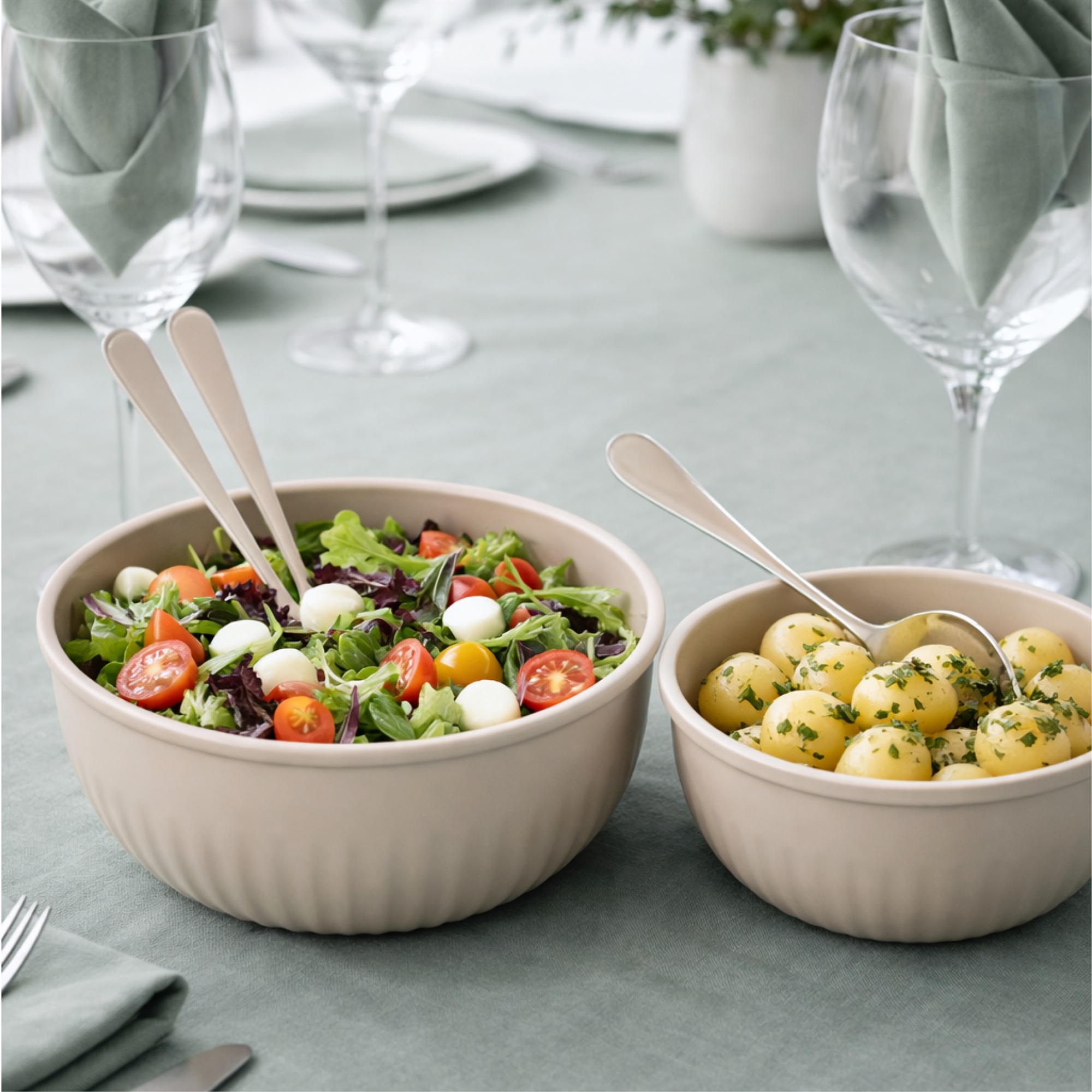 Skålene fungerer også som flotte serveringsskåle til borddækningen, hvor det enkle beige design skaber et roligt og indbydende udtryk. Når måltidet er slut, er det nemt at sætte låget direkte på skålen og stille den i køleskabet eller fryseren. Det gør opbevaring af rester hurtig, hygiejnisk og praktisk – helt uden ompakning.