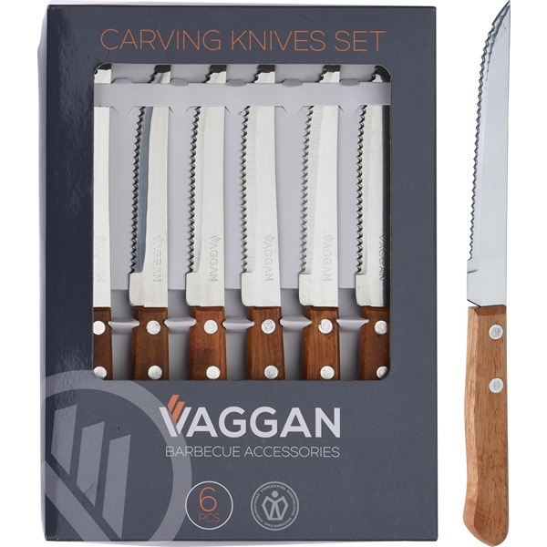 Steakknivene fra Vaggan er fremstillet i slidstærkt rustfrit stål. Den savtakkede klinge gør det let at skære igennem steaks, grillkød og andre kødretter uden at flosse kødet. Hver kniv har et ergonomisk håndtag i hårdt eucalyptus-træ, fastgjort med to nitter, som giver et solidt greb og et klassisk udtryk. Knivene måler 21 cm i længden, og bladet har en tykkelse på 1,0 mm. Vi anbefaler, at knivene vaskes op i hånden og ikke i opvaskemaskinen af hensyn til træskæfterne.