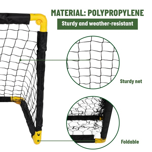 Målene er fremstillet i slidstærkt polypropylen, som er både let og vejrbestandigt. Nettet er robust og modstår mange timers spil, mens det kompakte design gør sættet nemt at opbevare, når det ikke er i brug.
